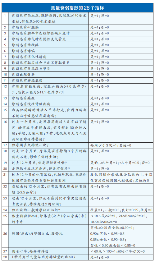 那么,如何計(jì)算自己的衰弱程度呢?研究規(guī)定,衰弱指數(shù)等于個(gè)體符合的疾病或缺陷數(shù),除以納入的疾病或缺陷總數(shù)(即28個(gè))。也就是說(shuō),如果一個(gè)人滿(mǎn)足或達(dá)到上述指標(biāo)中的至少7項(xiàng),身體狀況就可能到了衰弱期。