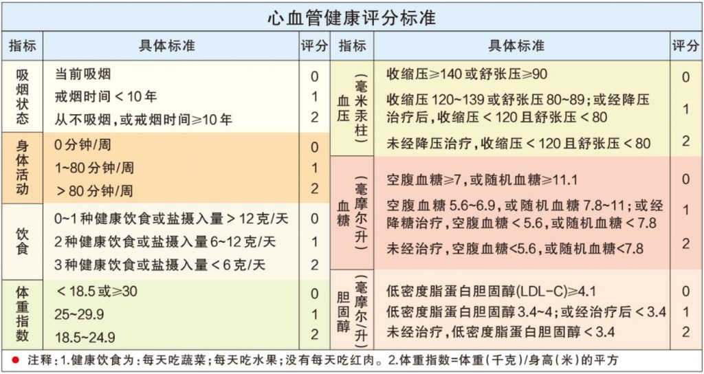在《中華醫(yī)學雜志(英文版)》上,華中科技大學同濟醫(yī)學院等機構的研究人員曾針對理想心血管健康與中國成年人死亡風險降低的關聯(lián)進行研究,根據(jù)近20萬人的健康數(shù)據(jù)分析得出,不論個人當前的醫(yī)學因素和生活行為是怎樣的,只要盡早以健康的生活行為和良好的心臟代謝狀況為目標采取措施,就可以減少過早死亡。他們還提出了適合評估國人心血管健康的評分標準(如圖),總分為0~6分,代表心血管健康水平不良,7~9分為中等水平,10~14分為理想水平。