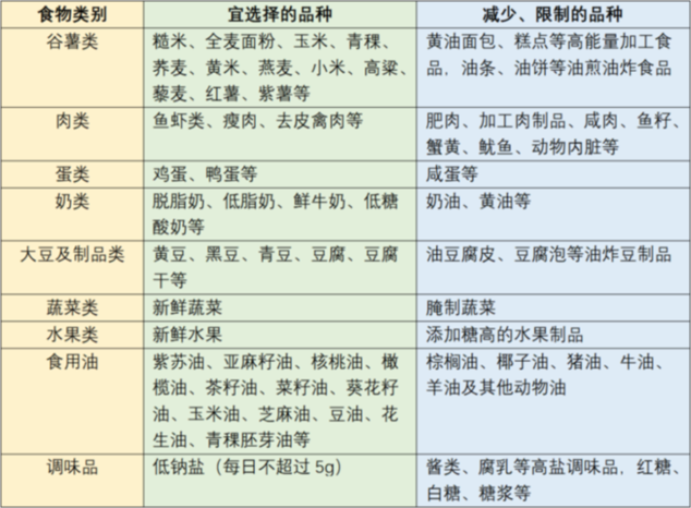 平衡膳食,食物多樣,食物種類每日不少于12種,每周不少于25種。應(yīng)攝入充足蛋白質(zhì),選擇脂肪含量較低的魚蝦、去皮禽肉、瘦肉等,奶類可選擇脫脂或低脂牛奶。提高大豆蛋白的攝入,每日攝入25g大豆蛋白,可降低心血管疾病的發(fā)生風(fēng)險。