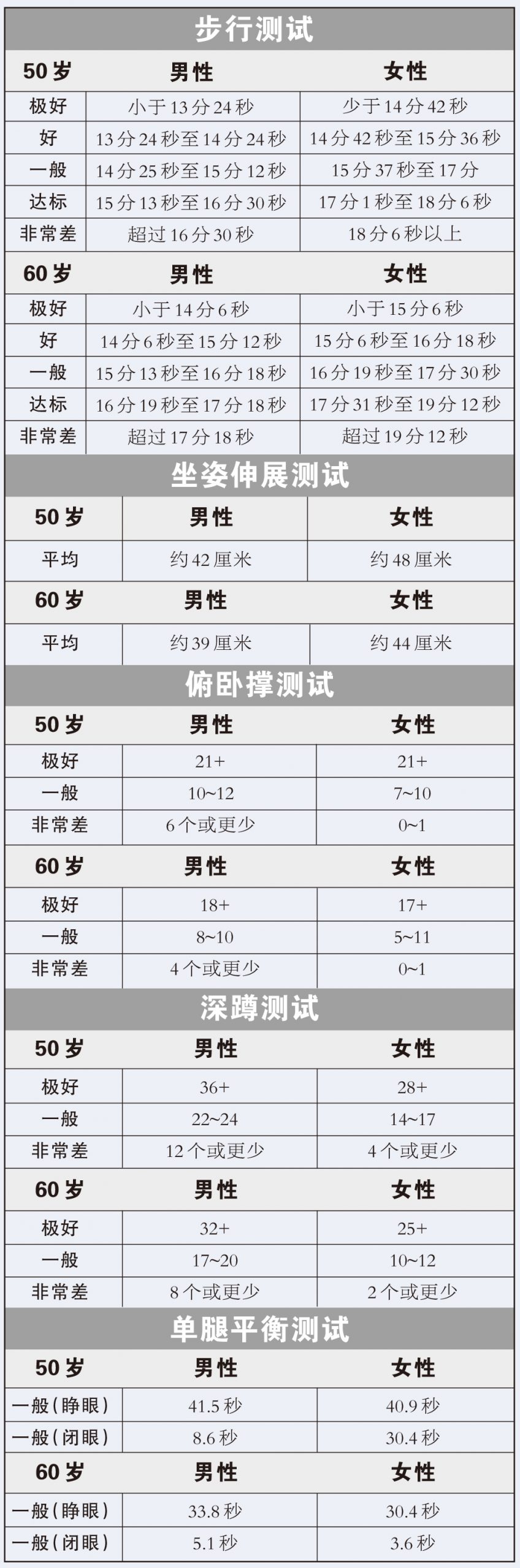 方法:赤腳站在墻邊或臺(tái)面旁邊。將一只腳抬離地面2.5~5厘米,以單腿保持平衡,記錄堅(jiān)持金雞獨(dú)立的時(shí)間。之后,換另一條腿,可根據(jù)自身情況重復(fù)測(cè)試,取最好成績(jī)。最后閉眼再進(jìn)行單腿平衡測(cè)試。